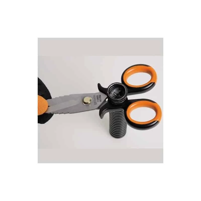 Ciseaux d’électricien avec profils à fraise graduée avec étui. Conçus pour élargir les trous sur les boîtes de dérivation en plastique et fermer les tuyaux plissés. Etui articulé accrochable à la ceinture. Branches bi-matières. Axe anti-desserrement. Système Breveté.