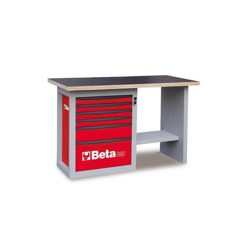 Établi avec un servante modèle court à 6 tiroirs, plan de travail en bois contre-plaqué stratifié avec trous pour l’installation d’un étau 1599F/125, en option. Fonds des tiroirs protégés par un tapis en Néoprène. La façade des tiroirs est en nylon haute résistance. Les servantes sont prévues pour l’insertion de plateaux thermoformés. Serrure de sécurité centralisée frontale. Avec compartiment inférieur porte-objets. Prévu pour porte-papier 2400S-R/PC et porte-flacons 2400S/PF, en option. 12 Tiroirs montes sur glissières à billes de précision.