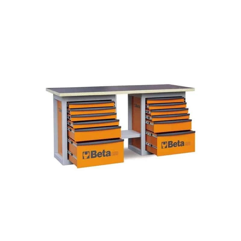 Établi « Endurance » avec 2 servantes à six tiroirs, montés sur glissières à billes de précision, leurs fonds sont protégés par un tapis en Néoprène. Prévu pour l’insertion de plateaux thermoformés. Tablette en bois contre-plaqué stratifié avec trous pour l’installation d’un étau 1599F/125 en option. Serrure de sécurité centralisée frontale. Compartiment inférieur porte-objets.