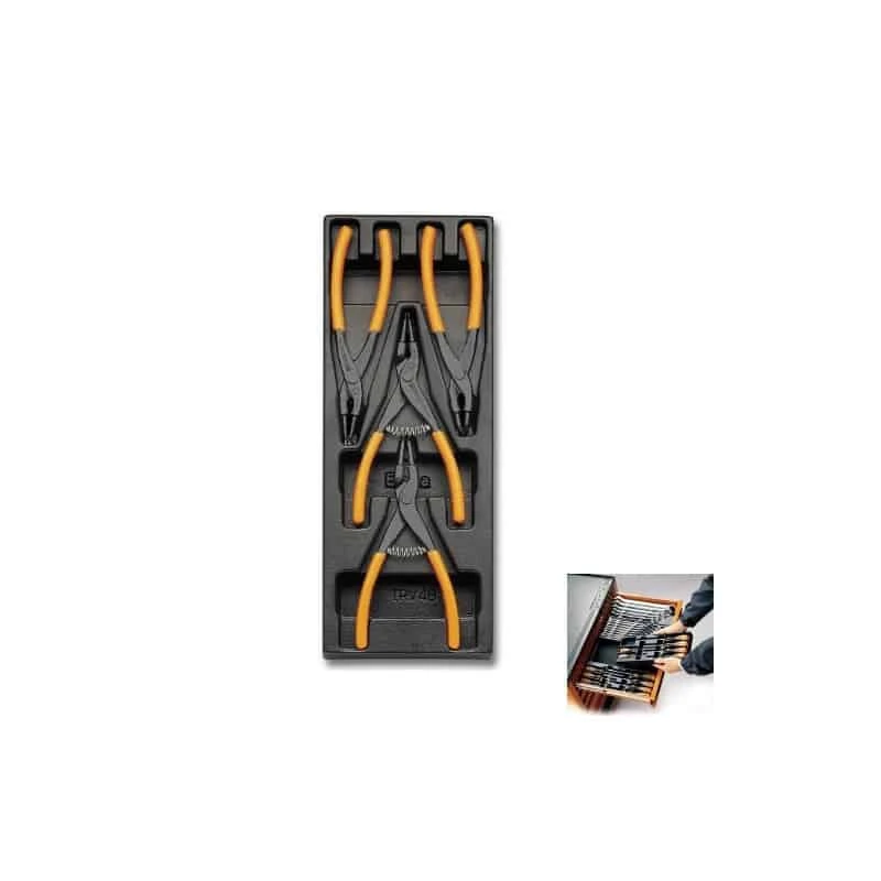 Plateau thermoformé rigide avec comprenant 4 pinces , dont une pince pour circlips intérieurs à becs droits, une pince pour circlips intérieurs à becs coudés, une pince pour circlips extérieurs à becs droits, et une pince pour circlips extérieurs à becs coudés