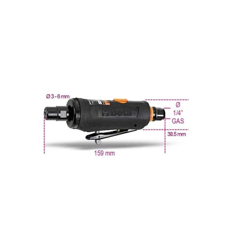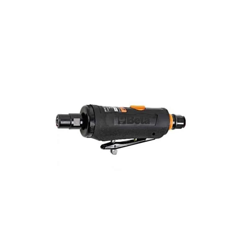 Meuleuse droite légère et maniable, équilibrage optimisé grâce à deux roulements à billes. Régulateur de vitesse à bouton. Prise d’air pivotante, échappement de l’air par l’arrière avec silencieux. Corps et poignée en matériau antidérapant. Levier de sûreté à déclenchement, elle est fournie avec pince de 3 et 6 mm.