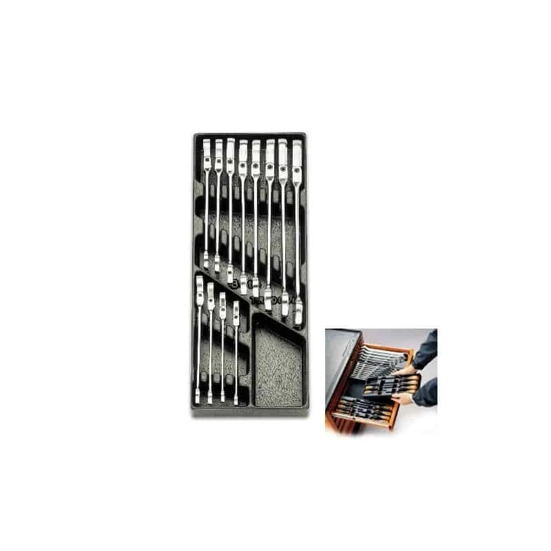 Plateau thermoformé rigide contenant 12 clés mixtes à cliquet articulé de 8 à 19 mm. Détail: 8 – 9 – 10 – 11 – 12 – 13 – 14 – 15 – 16 – 17 – 18 et 19 mm