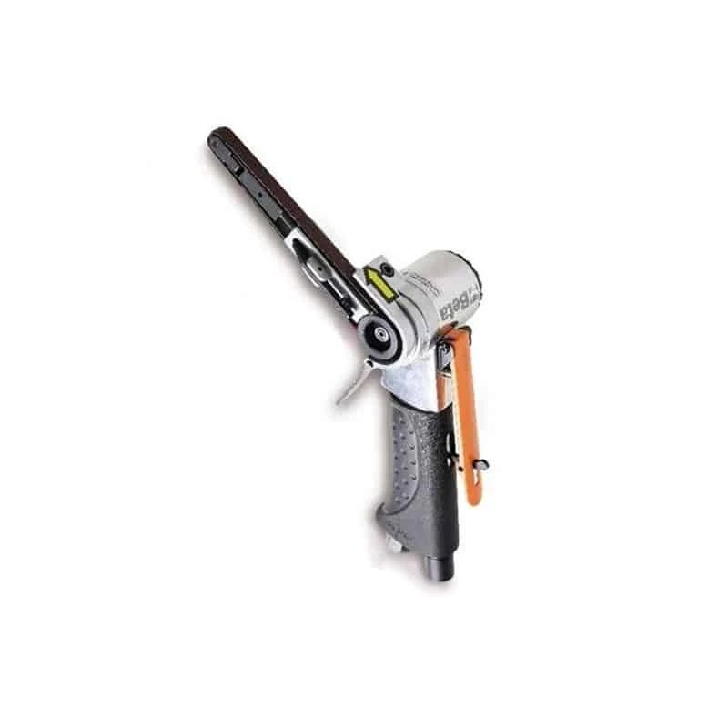 Cette ponceuse à bande de 10 mm, est idéale pour intervenir dans les espaces réduits. Bras de ponçage orientable et réglable, poignée antidérapante. Remplacement rapide de la bande et protection de sécurité de cette bande. Prise d air pivotante et échappement de l’air par l’arrière avec silencieux. Levier de sûreté à déclenchement