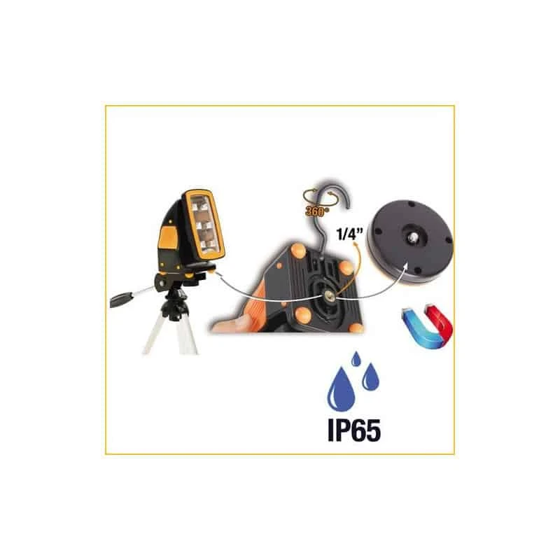 Spot rechargeable ultra-compact, étudié pour offrir la meilleure solution possible en toute occasion. Éclairage généreux et toujours prêt! avec une capacité d’éclairage maximum de 650 lumens et la possibilité de travailler avec batterie ou câble, il est toujours prêt à l’emploi. Installable partout ! – sur plans : avec pieds en caoutchouc sur trois côtés ou avec entraînement de 1/4″ pour chevalet standard type appareil photo. – sur structures métalliques : avec aimant dévissable ou crochet orientable à 360° Robuste: étudier pour résister aux sollicitations mécaniques les plus sévères, sa garantie de durée dans le temps est garantie. Minimum d’encombrement, il peut être logé de manière pratique dans la sacoche à outils et utilisé dans des lieux exigus. Chargeur 12 V depuis allume-cigares ou prise 230 V, permet le fonctionnement même en cas de batterie complètement déchargée. Câble de recharge et éclairage de 5 mètres Durée d’éclairage jusqu’à 7 heures cela en fonction de la luminosité.