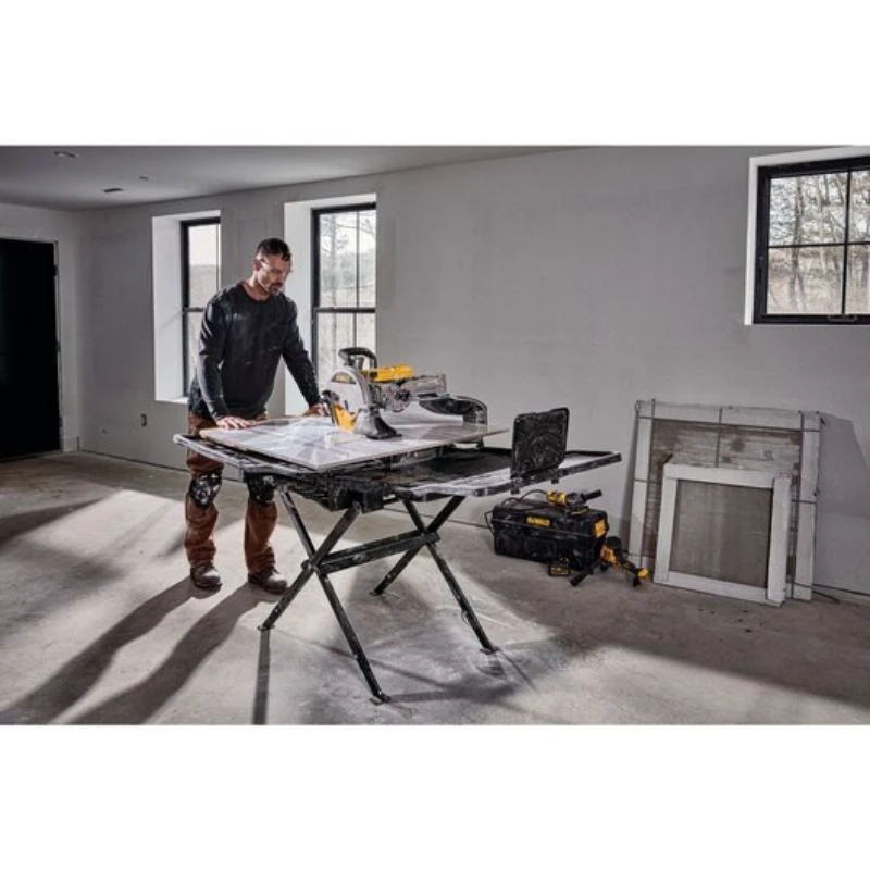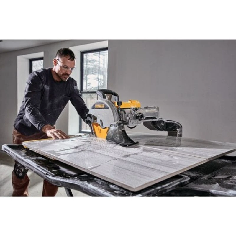 La D36000-QS est une scie à matériaux 250 mm offrant une capacité de coupe en longueur de 940 mm et une profondeur de coupe maximale de 80 m. Le dégagement à gauche de la lame permet la découpe de carreaux de carrelage de 914 mm x 914 mm en deux. Un système de bac à eau permet de contenir les carreaux de 457 mm x 914 mm et 609 mm x 609 mm dans la zone de couverture ce qui limite les débris et éclaboussures. La machine dispose également d’un indicateur de ligne de coupe, d’un cadre rigide et de rouleaux en acier inoxydable (sur le chariot) fournissant une grande précision de coupe.