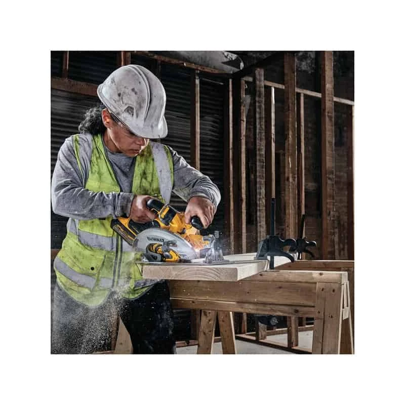 La scie circulaire DEWALT DCS573 est équipée d’une lampe LED intégrée pour éclairer la ligne de coupe et améliorer la précision sur les chantiers les plus difficiles.