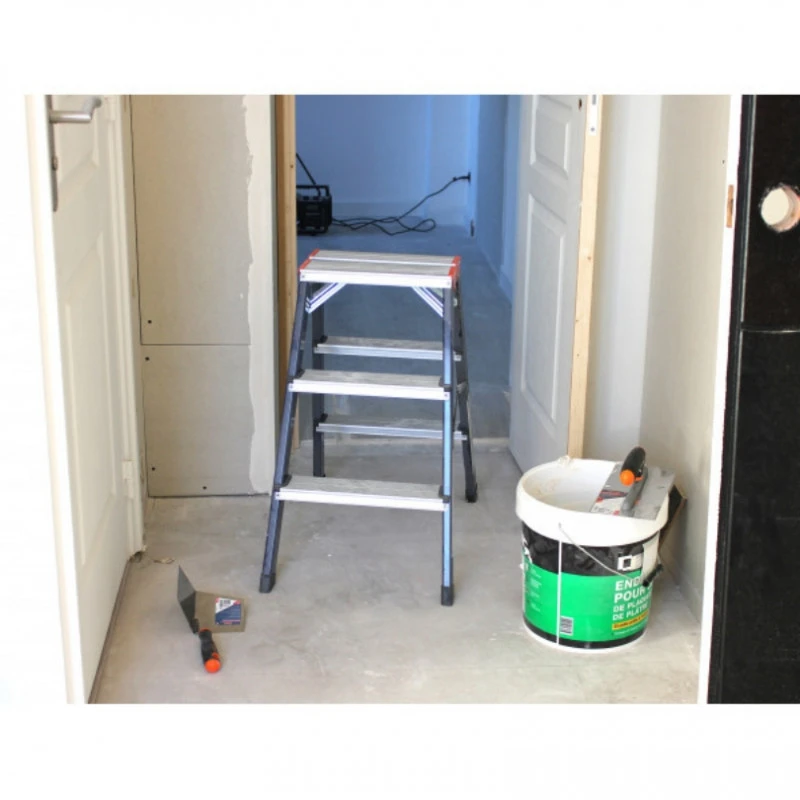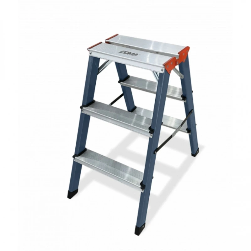 Ce marchepied en aluminium possède 3 marches et est accessible des deux côtés. Ses 4 patins sont antidérapants. Sa hauteur max est de 65,4 cm, sa charge max est de 150 kg. Il est certifié EN-14183.
