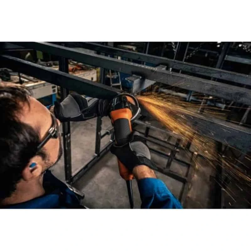 La meuleuse d’angle 125mm est robuste avec son moteur puissant et rapide ainsi que durable grâce à la protection contre les surcharges et à la longue durée de vie des charbons. De plus, l’utilisateur bénéficie d’une bonne protection grâce au contrôle de retour de choc, au démarrage progressif, à la poignée anti-vibrations et à la protection contre le redémarrage intempestif.