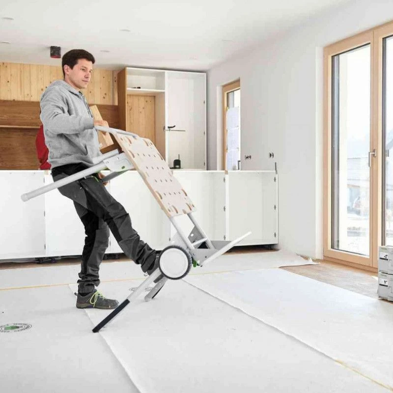 Le châssis de transport UG-CSC-SYS de Festool est la solution polyvalente 3-en-1 idéale pour les travaux de montage. Il est facile à transporter grâce à ses roues solides et peut transporter jusqu’à 80 kg de charge, tout en occupant peu d’espace une fois replié. En un tour de main, il peut être transformé en une table de travail pratique, avec une plaque de 58 x 58 cm perforées pour fixer les pièces en toute sécurité. Les pieds rabattables sont pratiques pour compenser les inégalités du sol.