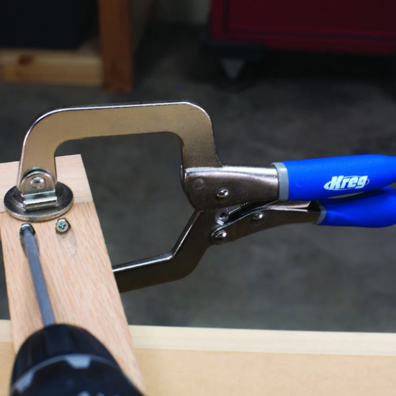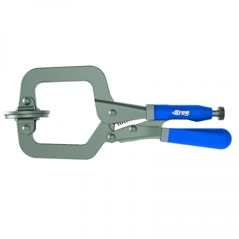 La pince de serrage Ă face plate de Kreg est un outil qui permet d’effectuer un serrage solide sur des matĂ©riaux jusqu’Ă 70 mm d’Ă©paisseur, sans les abĂźmer. Les pinces sont dotĂ©es de larges patins de serrage qui rĂ©partissent la charge de serrage sur les diffĂ©rentes piĂšces. L’outil se positionne sur le cĂŽtĂ© du joint et possĂšde une simple vis qui ajuste la pince Ă l’Ă©paisseur du matĂ©riau.