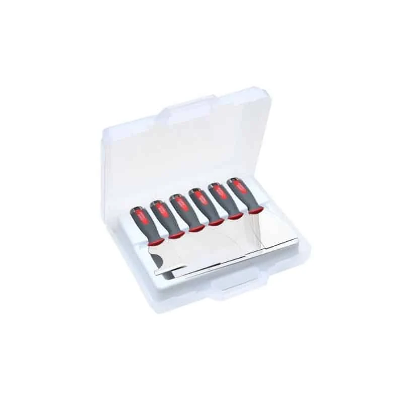 Pour enduire les joints des plaques de plâtre et la pose de bandes, L’Outil Parfait propose un kit de 6 couteaux dont un 6 en 1.