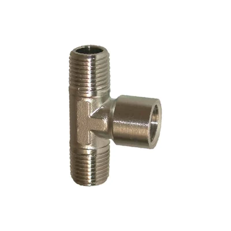 Raccord en laiton nickelé Lacmé 358 901 – Filetages et taraudage coniques : 1/4” Mâle – 1/4” Femelle – 1/4” Mâle – Té à 90° – Plat 13 mm.