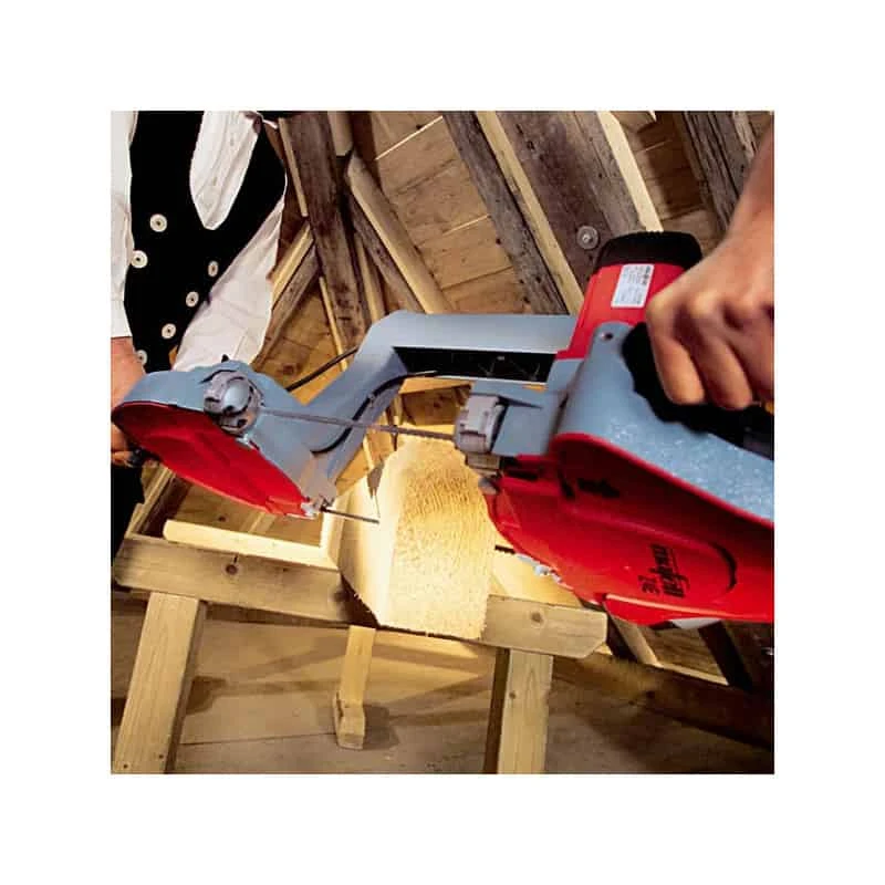 Lame à ruban à double denture, pour reculer sans problème dans l’entaille de sciage, surtout si la lame à ruban est bloquée par le frein de sécurité mécanique.