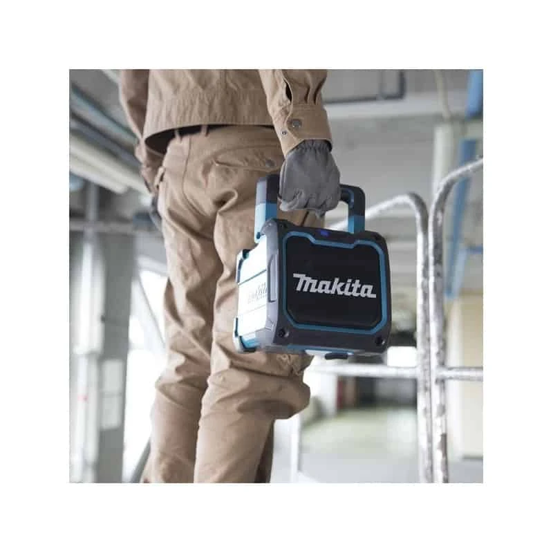 Son fonctionnement hybride lui permet de fonctionner sur batterie ou sur secteur (230V) et est compatible avec les batteries 10,8 V CXT, 14,4 V et 18 V de chez Makita, pour plus de simplicité. La portée du Bluetooth est de 10 mètres mais si vous avez peur pour votre smartphone, un petit compartiment étanche lui est réserver à l’arrière de l’enceinte. Enfin, si vous préférez, il est toujours possible de relier l’enceinte par un cordon Jack standard à votre PC ou même votre tablette.