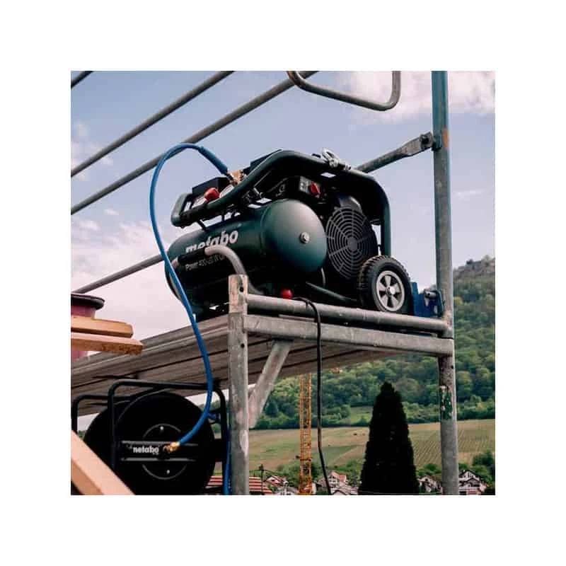 Silencieux et sans vibrations, le compresseur à pistons METABO Power 400-20 W OF convient parfaitement pour le fonctionnement en continu sur les chantiers en extérieur comme en intérieur.