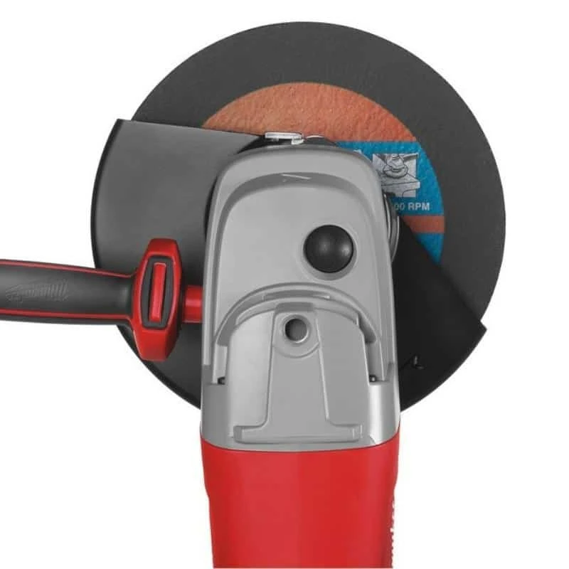 La vitesse de la meuleuse est constante et bénéficie d’un démarrage progressif. De plus, la poignée de l’outil est pivotante sur 360° pour les travaux de tronçonnage.