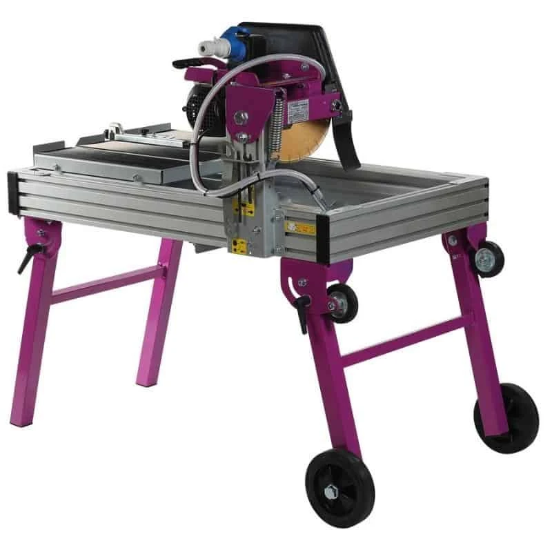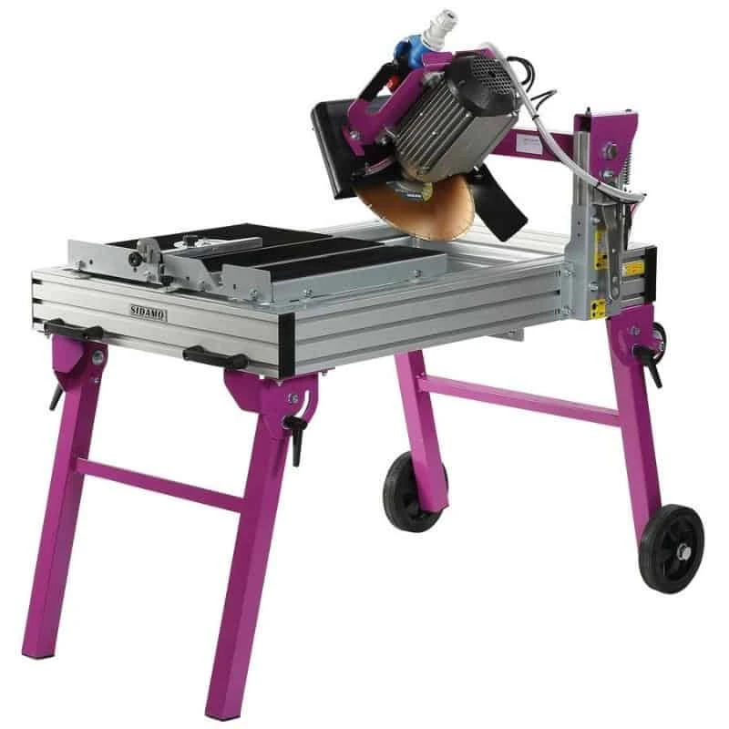 La machine possède un circuit de refroidissement du disque sur les deux faces avec une pompe électrique à débit réglable par robinet pour assurer un meilleur rendement. Très confort, la scie est dotée d’un chariot à galets qui se déplace sur rails indépendant du bâti et de roues de transport.