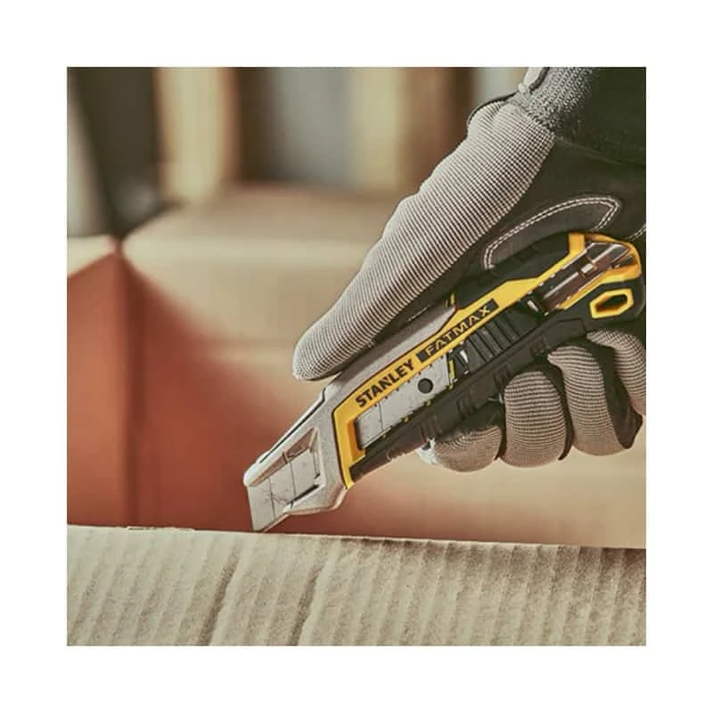 Le cutter 18 mm Quick Snap Fatmax Stanley est doté d’un mécanisme casse-lame qui permet d’avoir une lame toujours tranchante rapidement, facilement et en toute sécurité. Plus besoin d’utiliser un autre outil pour casser la lame. Lorsque la lame est émoussée, il suffit de placer le haut de la lame le long de la ligne symbolisant le bon emplacement et d’actionner le mécanisme casse-lame. Le segment usagé est alors cassé instantanément et un aimant vient le retenir pour éviter les blessures.