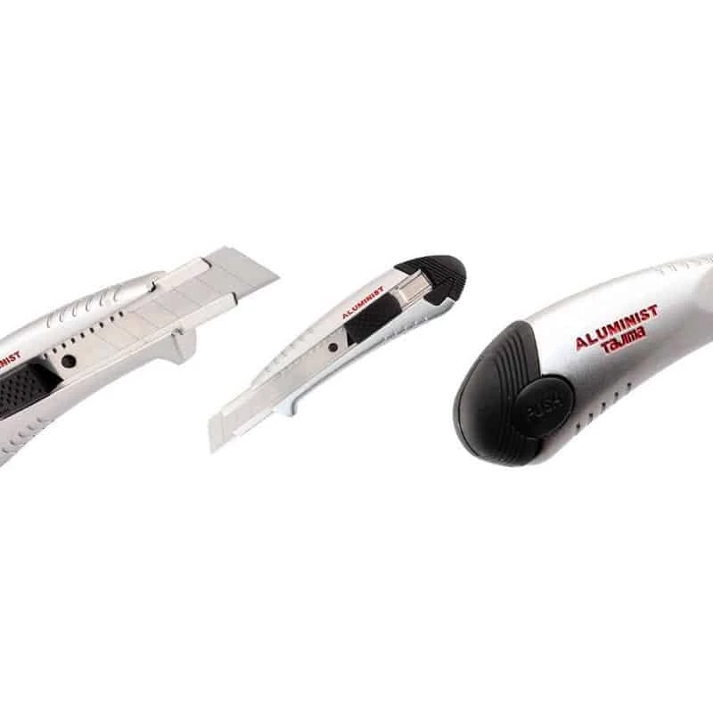 Le cutter Tajima est un couteau renforcé en aluminium de 18 mm. L’outil possède un rangement des lames de rechange dans la poignée.