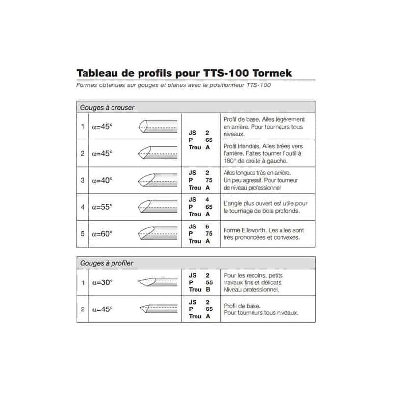 Le positionneur TTS100 breveté pour outils de tournage est la clé de l’affûtage Tormek pour le tournage sur bois. Il vous permet de créer l’affûtage précis de vos gouges à creuser et à profiler et de le reproduire parfaitement, de même que pour vos planes rectangulaires ou ovales avec un tranchant droit ou concave.